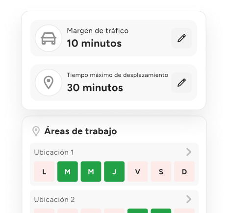 Establece zonas de trabajo para ti y tu personal, y relájate mientras tu sistema de reservas se encarga de optimizar el tiempo de desplazamiento.